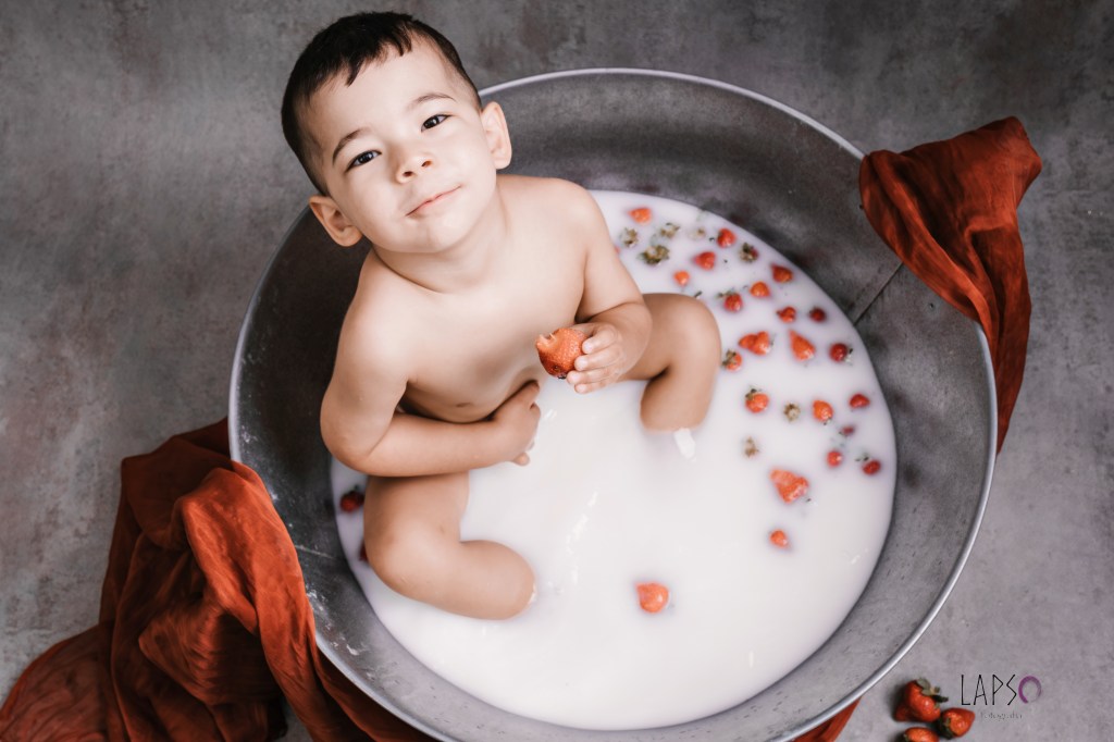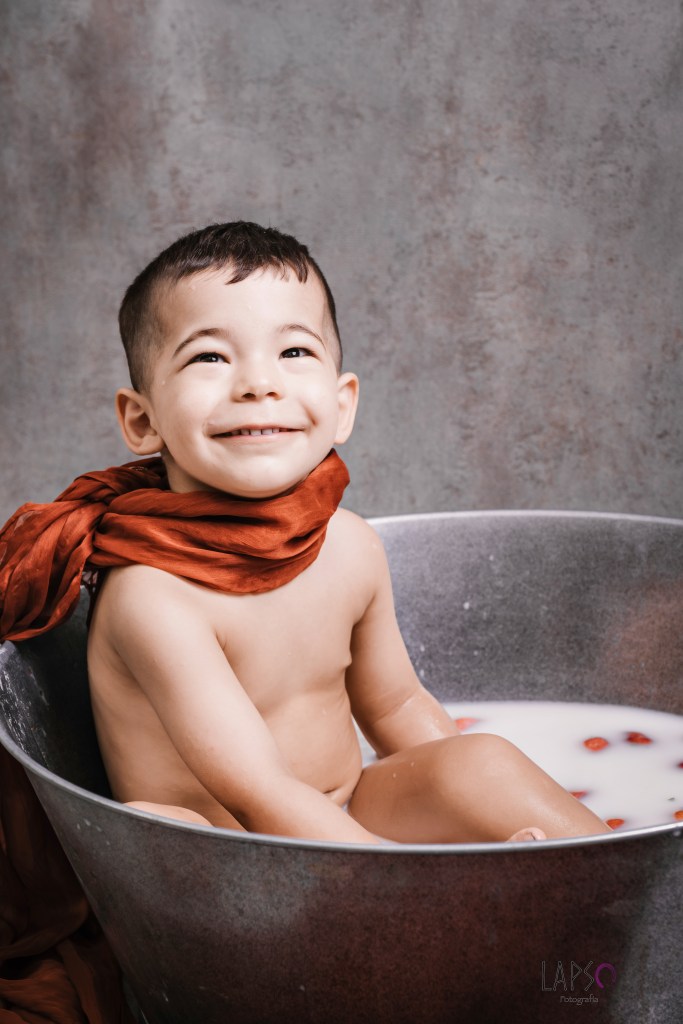 Pero no termina ahí. Después de la dulce diversión del pastel, llevamos la experiencia a otro nivel. Sumergimos a tu pequeño en un típico barreño de latón lleno de agua y leche, agregando fruta según su edad. Esta parte no solo es increíblemente divertida para los más pequeños, sino que también crea fotos únicas y memorables.